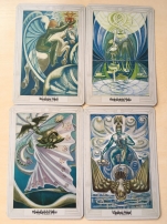 Длинная пуповина — соединение с космическим единством — окружает Дурака четырьмя спиралями. Возможность возрождения дана на всех четырех планах человеческого существования: духовном, интеллектуальном, эмоциональном и физическом. Пререквизитом является ваша готовность изменяться во всех областях, ваша ответственность за саморазвитие. Эти четыре спирали описываются следующим образом:
