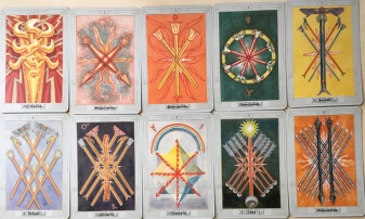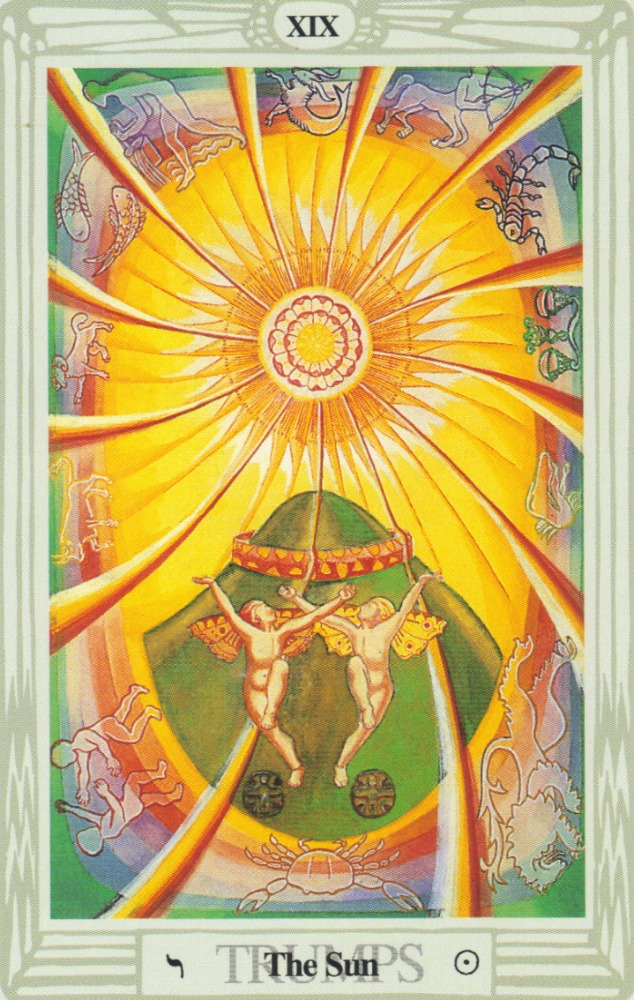 Вернемся теперь к символам карты. Все символы даны в парах, готовыми встретить свою противоположность. Трансформация происходит в брачном союзе. Это представлено орфическим крылатым яйцом и змеей, обвитой вокруг него. Дети держат в руках символы различных планов, на которые подействует трансформация; тело (палка), интеллект (копье), эмоции (чаша) и дух (цветы). Пики, образующие барьер на заднем плане, представляют конфликт между ограничением и свободой, связью и независимостью — компонентами любых отношений.