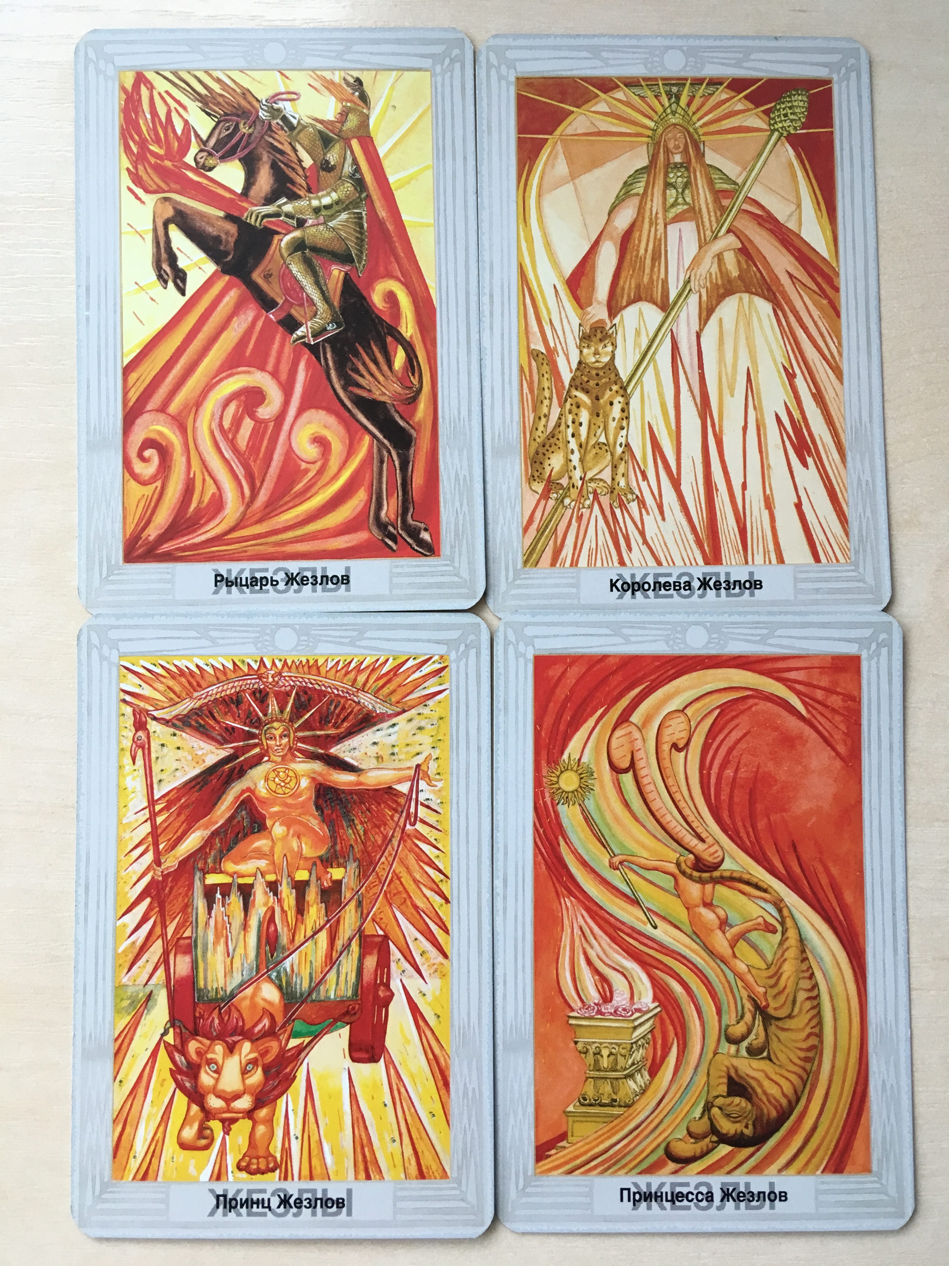 Четыре диска расположены в виде квадрата, представляя четыре угловые башни форта. На каждом — знак алхимического элемента. Эта формация символизирует благополучие и силу на всех уровнях бытия. Власть, выражаемая картой, показана в виде жесткой, почти твердой формы здания. Все — на своем месте. Никакие поверхностные орнаменты не украшают стены крепости.