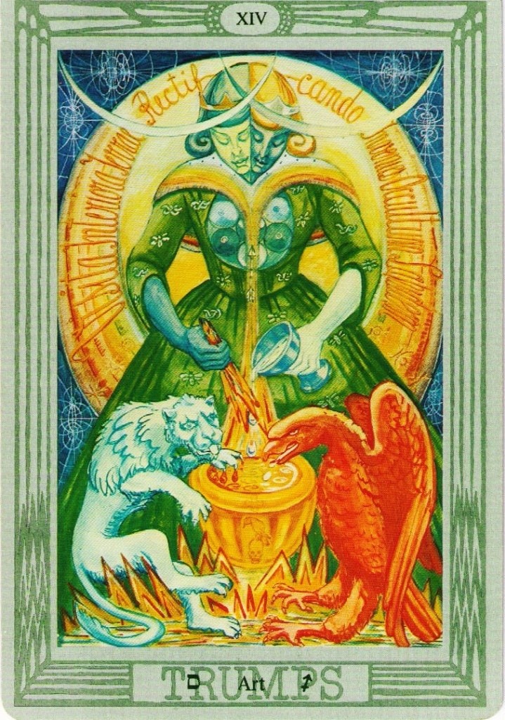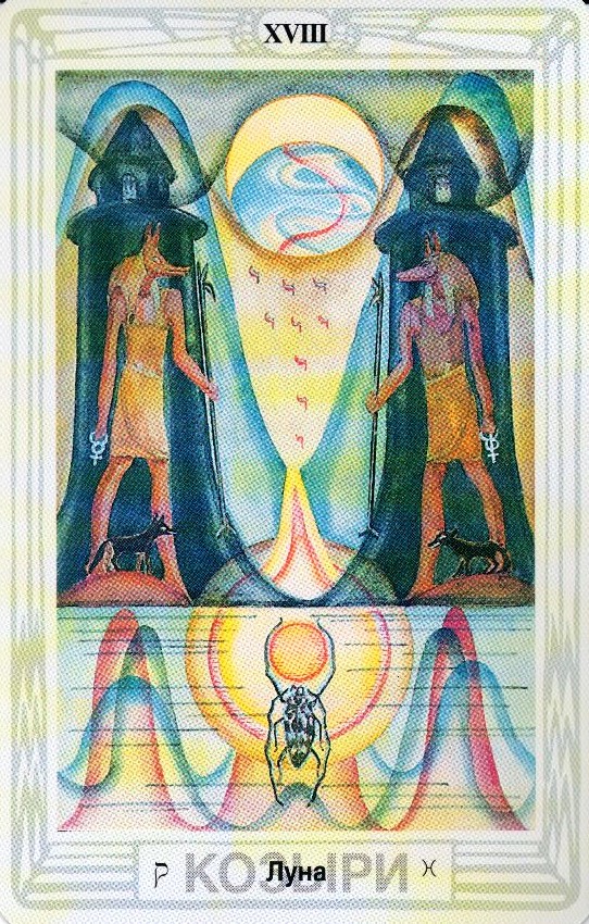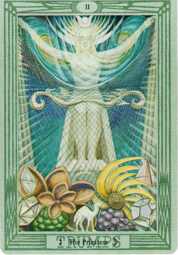 В данной колоде Жрица — одна из самых сильных карт баланса, равновесия и гармонии. Верхняя часть ее тела представляет женское — восприимчивое. Это подчеркивается идущими вверх линиями и указывающими вверх полумесяцами за ее головой. Ее корона — это Луна, получающая свет от Солнца.