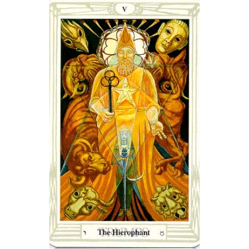 Иерофант объединил все эти элементы в себе и довел их до полного выражения. Он — Пробужденный, Преисполненный, Просветленный. Это истинный духовный мастер, который действует как посредник между человеческим и божественным. Он — дух, воплощенный в плоти (Бык), или последняя стадия человеческого развития, в которой человеческое объединяется с божественным.