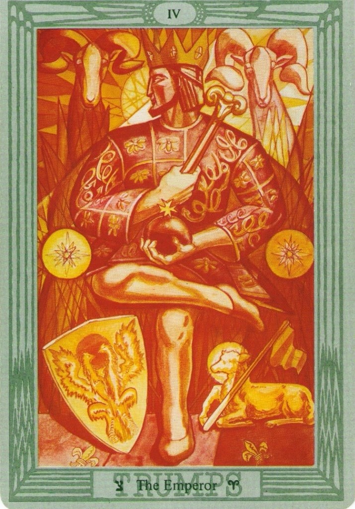 Описание и значение аркана Таро Император: Его трон, сверкающий огненными цветами Марса и Солнца, орнаментирован головами диких гималайских баранов. Его скипетр также несет этот символ власти и приключений. Откинувшийся назад ягненок с флагом мира представляет другой аспект барана. Качества истинного лидерства включают смирение и подчинение космическому закону, а также динамике власти. Глубокое понимание и постоянное осмысление воли Целого также необходимы. Правитель с такими качествами полон огромного сострадания, которое позволит ему жертвовать собой ради блага целого.