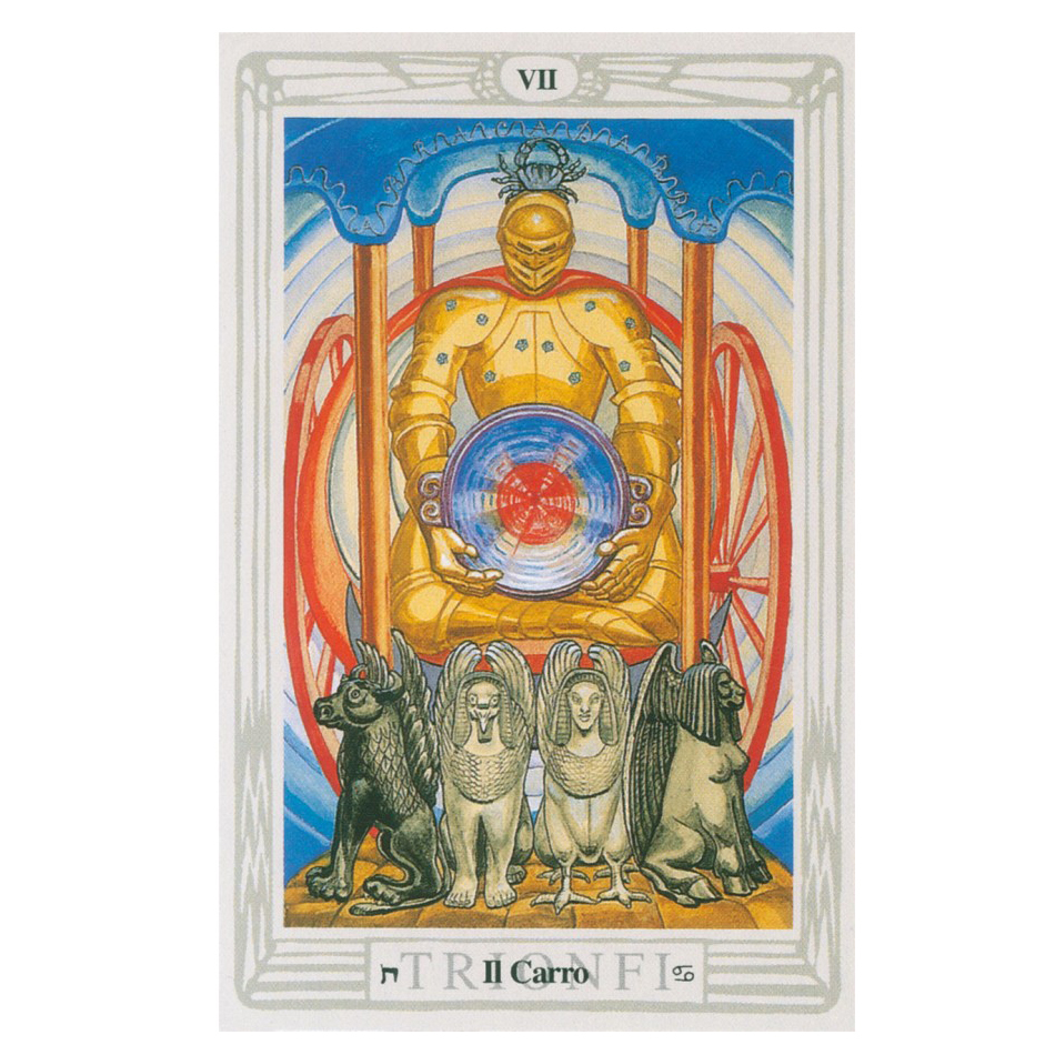 Описание и значение аркана Таро Колесница: Возница сидит в позе медитации в колеснице, которая еще не начала двигаться. Он одет в золотые доспехи и медитирует на Святом Граале, который вращается в его руках. Грааль символизирует Колесо Фортуны. Возница исследует все возможные последствия, перед тем как осмелиться направить колесницу к новому начинанию, так как, только возница решит двинуться с места, назад уже не повернуть. Ничего не сможет остановить путешествие.
