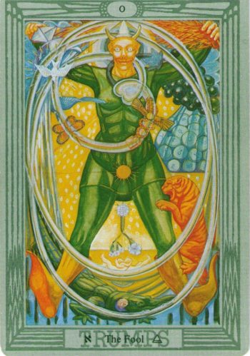 Описание и значение аркана Таро Дурак: Он представлен богом Весны, Дионисом. Зеленый цвет напоминает нам о мощной творческой силе Весны, Крокодил (древнеегипетский бог творчества) также несет величайшие творческие силы.