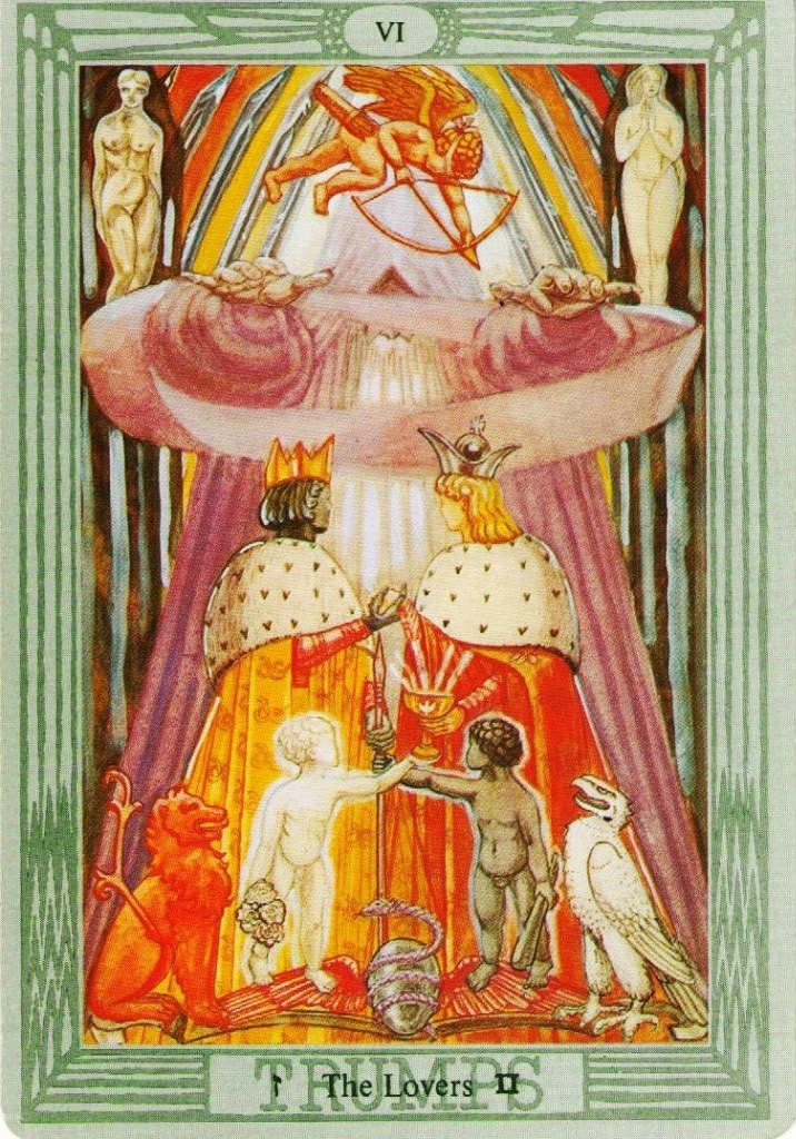 Описание и значение аркана Таро Влюбленные: Эта карта показывает женитьбу Императора и Императрицы. Церемонию проводит Отшельник — одна из форм бога Меркурия. Он полностью скрыт своими одеяниями, что символизирует, что происхождение всех вещей лежит вне доступа проявленного и интеллекта.