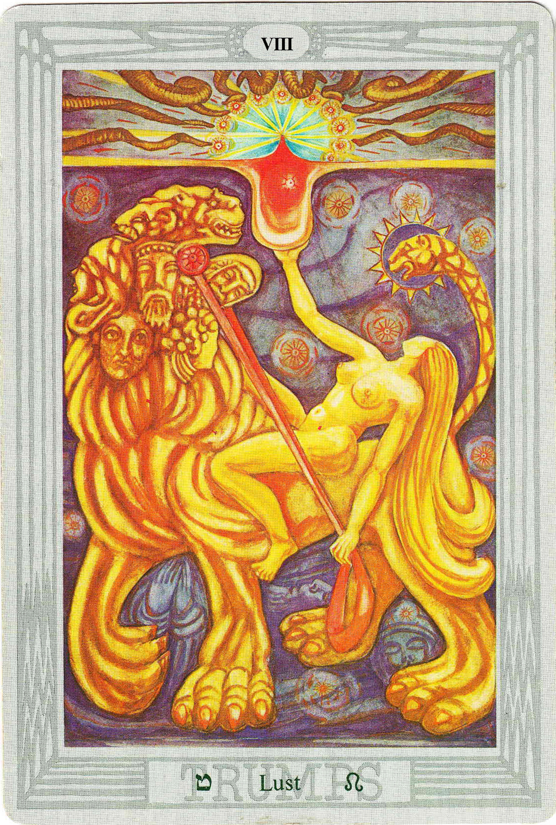 Тигр символизирует страх (см. Принцессу Жезлов). Тигр постоянно кусает Диониса, но его взор остается направленным вперед. Он не обращает внимания на страх, так что тот потерял свою власть над ним. Тигр совсем не может ему повредить. Его несокрушимая вера в существование позволяет ему осознавать страшные ощущения, не будучи их жертвой. Он освобожден, способен быть восприимчивым к высотам мистических переживаний и межличностному взаимодействию. Освобождены основные динамичные силы, которые влекут вперед. Невозможно удержать надвигающийся процесс творческого разворачивания.