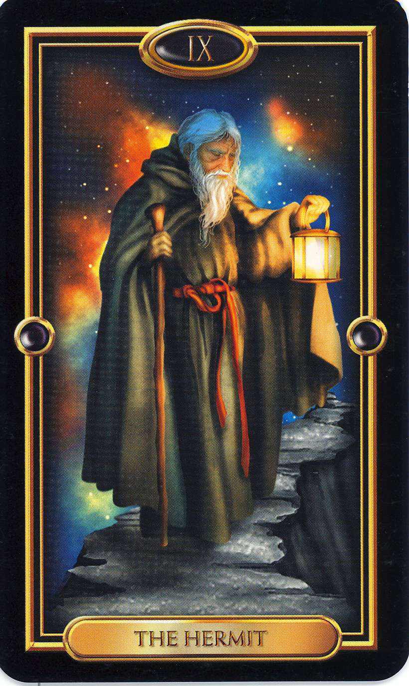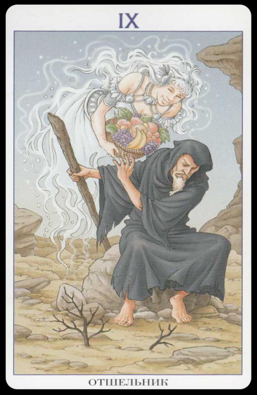 Отшельник акцентирует стремление замкнуться и потребность в самоанализе, обретение внутреннего мира и собственной правды, следование своим путем. Он говорит, что пришло время заново оценить свою жизнь, свои цели и связи. Пора чуть отойти от социальной жизни, оставить мелочные заботы и ставшие привычными развлечения: они мешают задуматься о душе. Каждому человеку требуется период уединения (“отшельничество”), чтобы разобраться наконец в себе самом. Однако это не просто тайм-аут, вообще вибрации Отшельника заметно превосходят Четверку Мечей. Они возвещают нахождение в своем собственном центре и нахождение своего собственного света. Главное, что возвещает Девятый Аркан – это отказ руководствоваться чужими мнениями (только собственным!), отказ делать что-либо наперекор себе, своему внутреннему ощущению истинного и верного, в угоду другим или просто соответственно всеобщим понятиям. Это карта духовной самостоятельности и огромной личностной силы, достаточной для того, чтобы идти своим узким путем, несмотря на отсутствие попутчиков (или хотя бы общественного одобрения).